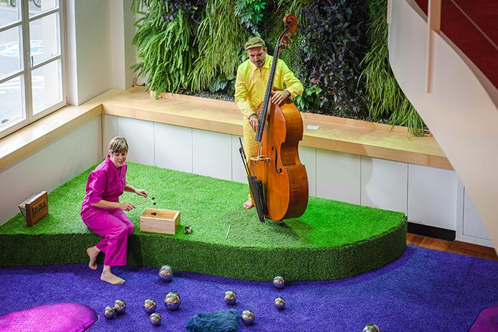 Jeder Tag ist anders und manchmal unvorhersehbar. Die Babys dürfen tun, wonach ihnen gerade ist, und Luca und Isa reagieren mit Kontrabass, Stimme, Zungentrommel und Shruti-Box darauf.
