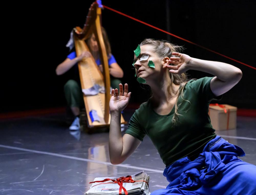 Eine musikalische und theatralische Performance mit einer Harfenistin und einer Schauspielerin. Mit Zeitungspapier, Karton, werden kleine poetische Geschichten erzählt. Im Zusammenspiel von Musik und Material erleben die Kinder die vielfältigen Eigenschaften, Formen und Geräusche dieser Materialien: leise und klein wie ein Schmetterling oder laut raschelnd und gross.
